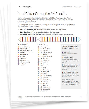 Use the knowledge of your talents 100%. Make an appointment to discuss the results of your survey. During the conversation, you will get additional tips and exercises on how to work with your Talents to strengthen them and turn them into strengths.